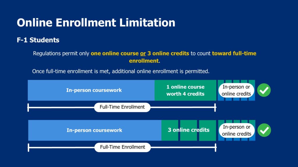 This graphic outlines the online enrollment limits for F-1 students, illustrating how one online course or up to three online credits can count toward full-time enrollment requirements.